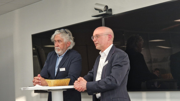 ( À gauche) Arnaud Le Gal, rédacteur en chef des Échos, et Patrice Bélie, président de Spherea. (À droite) Vincent Bronet, DG France de Spherea, présentant les dernières technologies développées par l'ETI toulousaine.